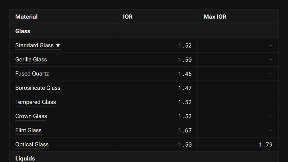 128 IOR Values for 3D Rendering